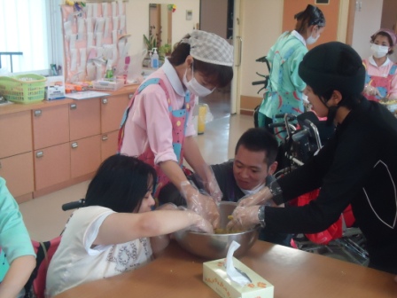 まずは、材料をボウルに入れ、混ぜていきます。利用者間で、ボウルを支えたりしながら協力して混ぜ合わせていきました。