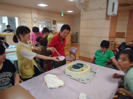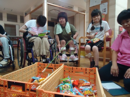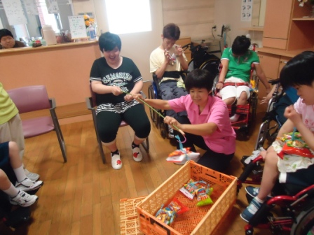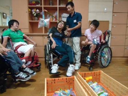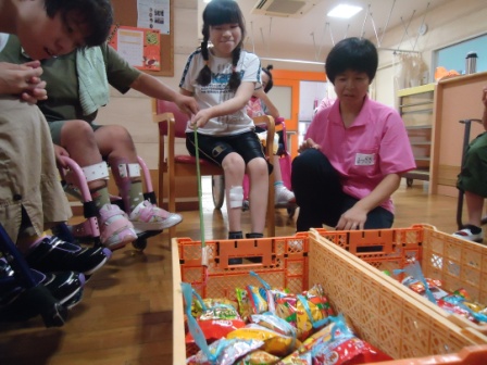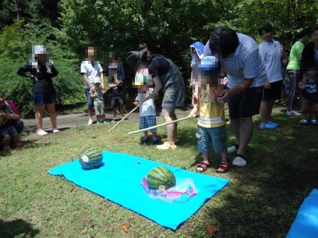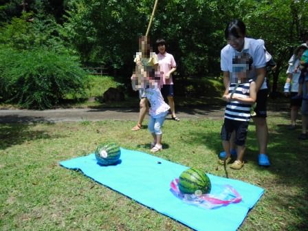 スイカ割りです。一人ずつ目隠しをして行ないました。