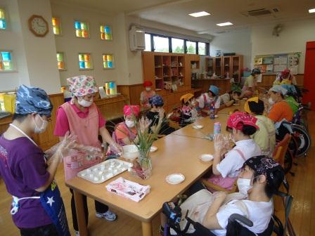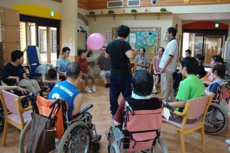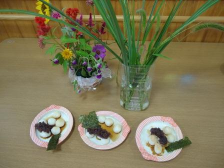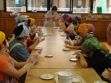 日本固有の伝統や食の文化等の流れに触れた後に利用者の方々へ季節感を味わっていただこうと十五夜のお話を実施し、お団子作りを致しました。すすきや栗等を準備し、利用者・職員共に持参した浴衣や甚平を着用することで季節を感じる活動となりました。