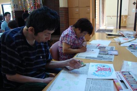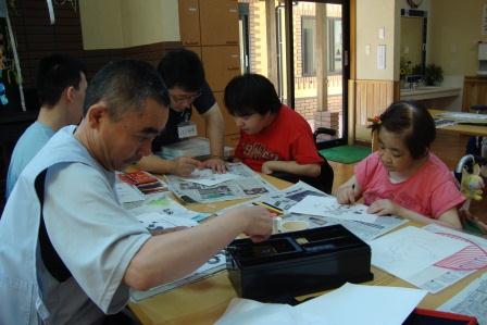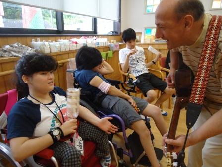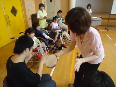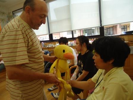 8月2日(木)、「英会話」を実施しました。 英会話では、様々な物語を本にした大型絵本や、職員自らが人形になりきり、利用者とともにゲーム感覚で英会話を楽しむ等、英単語の楽しみを身体で表現し、意味を理解しながら活動を行っております。 馴染みのある音楽の演奏で英会話のスタートです♪ 英語を歌にのせるとなんだか自然とリズムが溢れてきます☆ 今回は、黄色いあひるの登場です! 毎回、様々なぬいぐるみが登場し、英語で話しかけてくれます (*^_^*) 英会話の終盤では、職員の演奏する音楽に合わせて ダンスを行います。 一生懸命に体を動かします♪