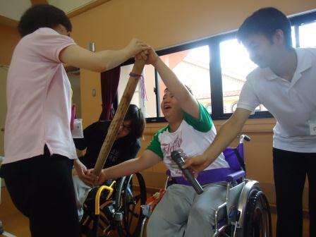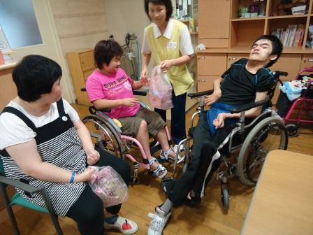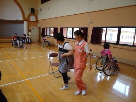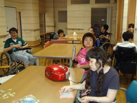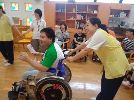 7月19日(木)、7月の誕生者の慶会で車椅子競走大会とカラオケ大会を行いました。 車椅子競走では、みなさん盛り上がって身体を動かすのを楽しんでいました。 優勝チームには手作りのメダルが授与されました。 カラオケでは、ご自分の好きな歌を熱唱されていました。 歩行の方も頑張るぞ~ お互い頑張ろうね~ マイクを持って歌手になった気分~ 誕生者の方へお祝いのカードを渡して おめでとうございまーす。
