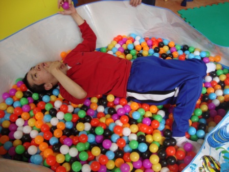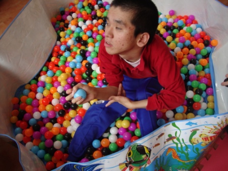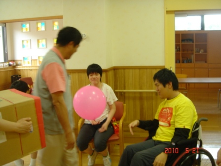 の中に入り、職員と一緒に少しだけ風船に触っ