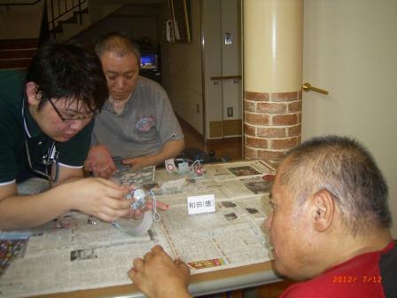 7月の慶会では、暑い夏を乗り切って頂こうと『うちわ製作』を行い、様々な種類のシールやモール等を用い、利用者個々でオリジナルな作品を作りました。主役の誕生者も終始表情良く参加され、思い思いの作品が完成致しました。