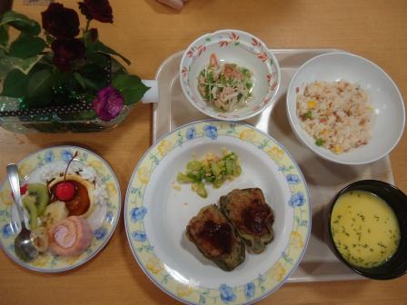 誕生者ご希望の慶会食はピーマンの肉詰め・サーモンサラダ