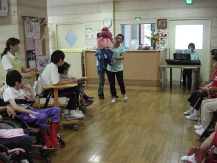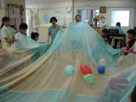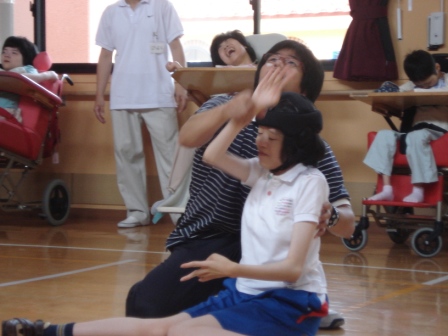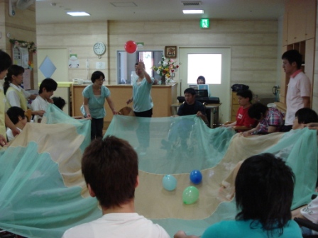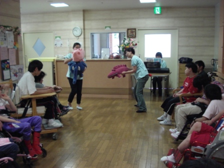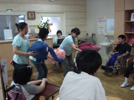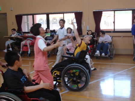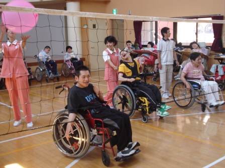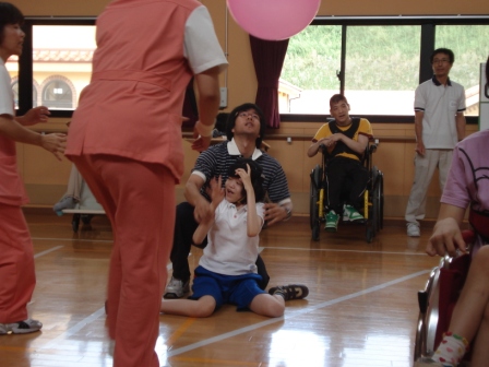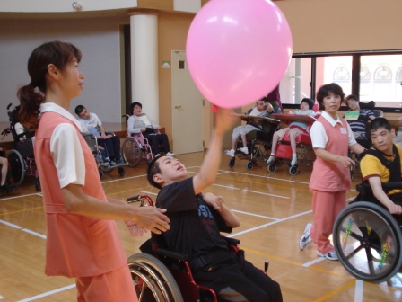 松ヶ尾と合同で施設対抗の風船バレー大会を行いました。利用者の方々も職員も一生懸命