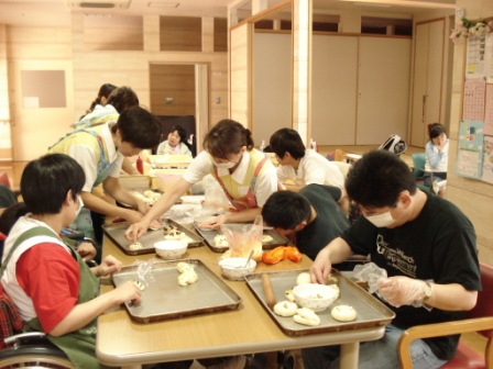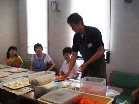 ベーカリー工房の指導員にアドバイスをもらいながら、パン作りを通して