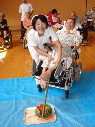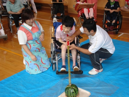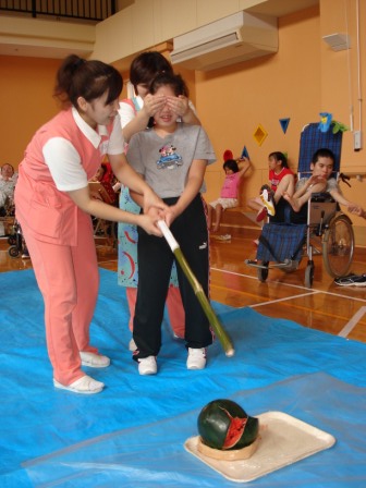 実習生と一緒にスイカ割り!(写真:左)